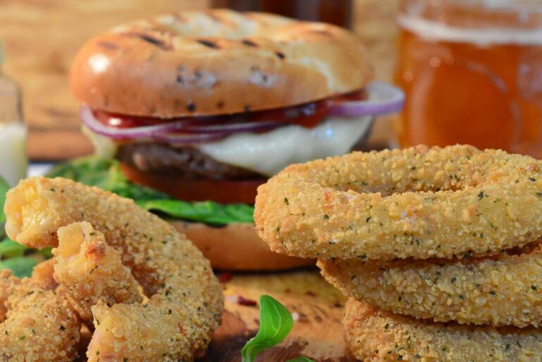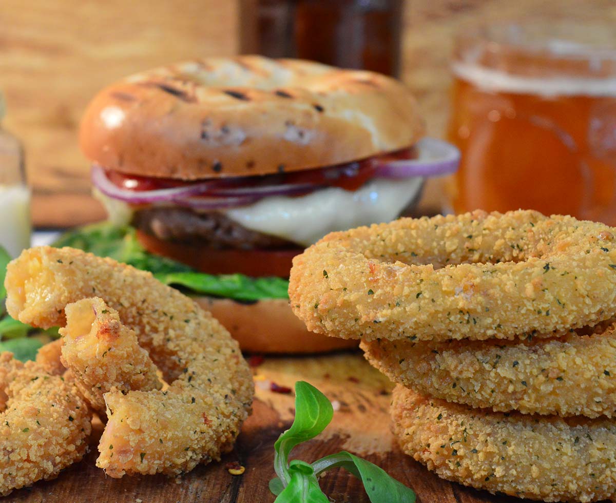 Cheese ‘O’s (seen above) are cheese and onion rings made from creamy Monterey Jack and Cheddar cheese with finely chopped red onions wrapped in a crispy breaded coating. After 10 minutes in the oven they are ready to plate.