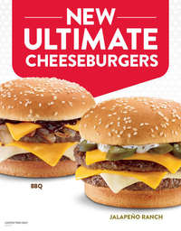The Jalapeño Ranch Ultimate Cheeseburger is stacked with two beef patties, American cheese, Swiss-style cheese, sliced jalapeños and ranch sauce for a cool and creamy kick, while the BBQ Ultimate Cheeseburger features two beef patties, American cheese, Swiss-style cheese, barbeque sauce and caramelized onions.