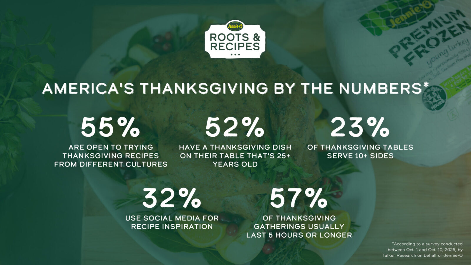To better understand this cultural shift, Jennie-O is revealing the results of its Roots & Recipes Report – a survey that documents how family heritage shapes what’s eaten, what is cooked, and the way folks gather around the holiday table. The findings reveal a nation that honors tradition while embracing change, with over half of Americans open to trying dishes from other cultures.