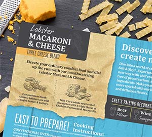 Now, just in time for Thanksgiving feasting among family and friends, East Coast Seafood of Topsfield, Massachusetts has debuted Lobster Macaroni & Cheese Blend featuring a blend of three cheeses under its newly launched Salt & Sky retail brand available at Giant Eagle and Hannaford retail stores in the Bay State as well as in Maine, Maryland, New York, Pennsylvania and Ohio. Two servings come per 340-gram box, which marks the first in a series of premiere frozen entrées now in the pipeline.