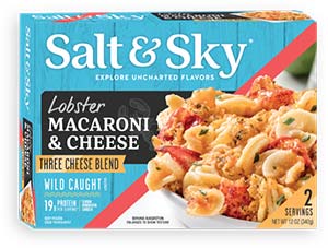 The three cheeses featured in the initial Salt & Sky Lobster entrée are Cheddar, Mozzarella and Parmesan, further accented with a zesty mix of herbs and spices. Chef-recommended beverage pairings for the dish, which may be prepared by conventional oven baking or microwaving, are Sauvignon Blanc wine or Pilsner beer.