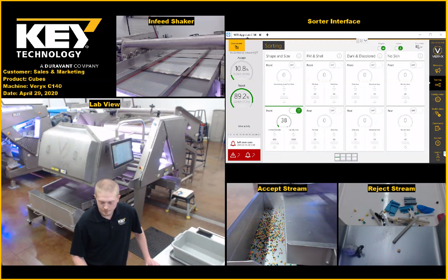 Virtual demos enable customers joining from anywhere in the world to collaborate with Key’s applications team and make observations, ask questions and, if needed, immediately effect a change in the process in real time. The live video interface includes a screen share of the system’s software and images from four or more cameras, with each one showing a different view of the system. On a digital sorter, one camera might be pointed at the whole system, one at the infeed, one at the accept stream, one at the reject stream and one at a table with accumulation samples from the different streams. The equipment is typically set up to run the customer’s product to accurately illustrate how the system will perform given their application. Virtual demos/tests/training can be recorded for later review.