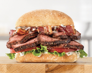 The Garlic Steak features thick-sliced tender filet steak, pepper bacon, green leaf lettuce and tomato on a toasted ciabatta roll and finished with roasted garlic butter, while the Steak & Bacon Melt boasts filet steak topped with melted cheddar, pepper bacon, crispy onions and steakhouse ranch sauce. Both offers will be available for a limited time.