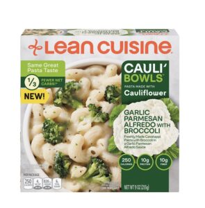 ◦ Cauli’ Bowls Garlic Parmesan Alfredo with Broccoli. This bowl, which has cavatappi pasta made with cauliflower and broccoli and garlic parmesan alfredo sauce, delivers one-third fewer net carbs than the same meal made with traditional pasta, plus 10 grams of protein, 10 grams of fiber and 250 calories.