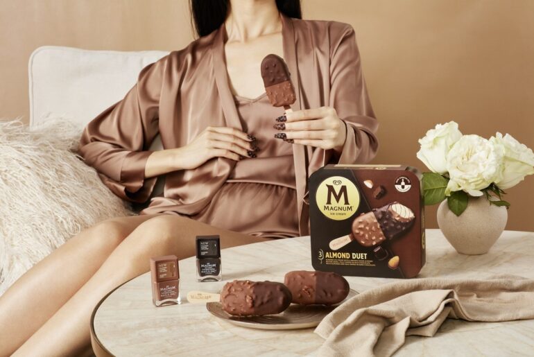 Magnum ice cream is collaborating with Nails.INC, an independent beauty brand, to launch a line of six chocolate-scented nail polishes inspired by the Unilever company’s new Magnum Duet Bars.