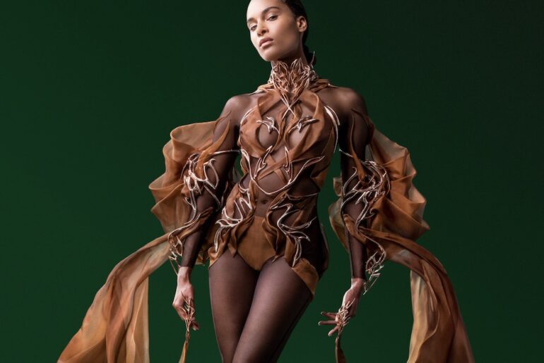 The dress is a celebration of Magnum ice cream’s plant-based vegan product range. It was created using an intricate 3-dimensional design, incorporating sustainable materials that reference Magnum ice cream’s vegan ingredients in an indulgent fusion between the brand’s iconic melting chocolate and Van Herpen’s luxurious fluid designs. With the aid of 3-D printing technology, the dress is also the first haute couture dress to be made from cocoa bean husks, which have been processed to create a fully organic biopolymer material.