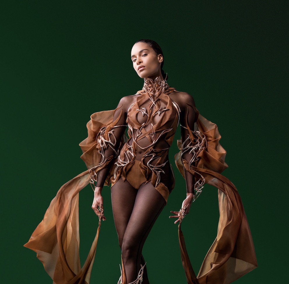 The garment features intricate details including plantlike body embellishments which are copper-coated, draped and entwined with upcycled and pliseed organza, while other 3-D elements have been printed using innovative SLS technology (Selective Laser Sintering).