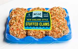 Gloucester, Massachusetts-based National Fish & Seafood has introduced recyclable blue plastic packaging for Matlaw’s brand offerings. The patent pending, sustainable trays will be available starting this summer for six- and nine-packs of grill-ready Stuffed Clams, as well as six-packs of New England Style Stuffed Scallops distributed through supermarket and other retail store frozen food cases in the USA.