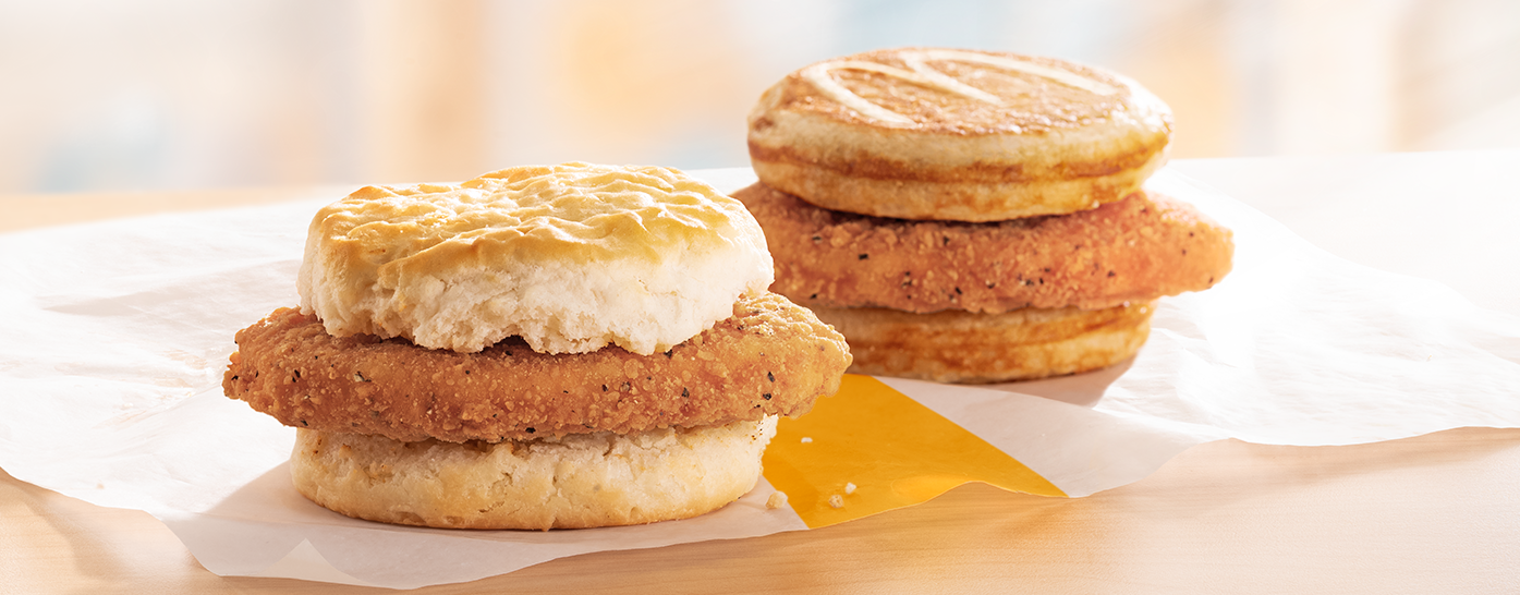 Chicken McGriddles are described as soft, warm griddle cakes with the sweet taste of maple, paired with a chicken patty, while the McChicken Biscuit is a warm, buttery biscuit paired with the McChicken sandwich.