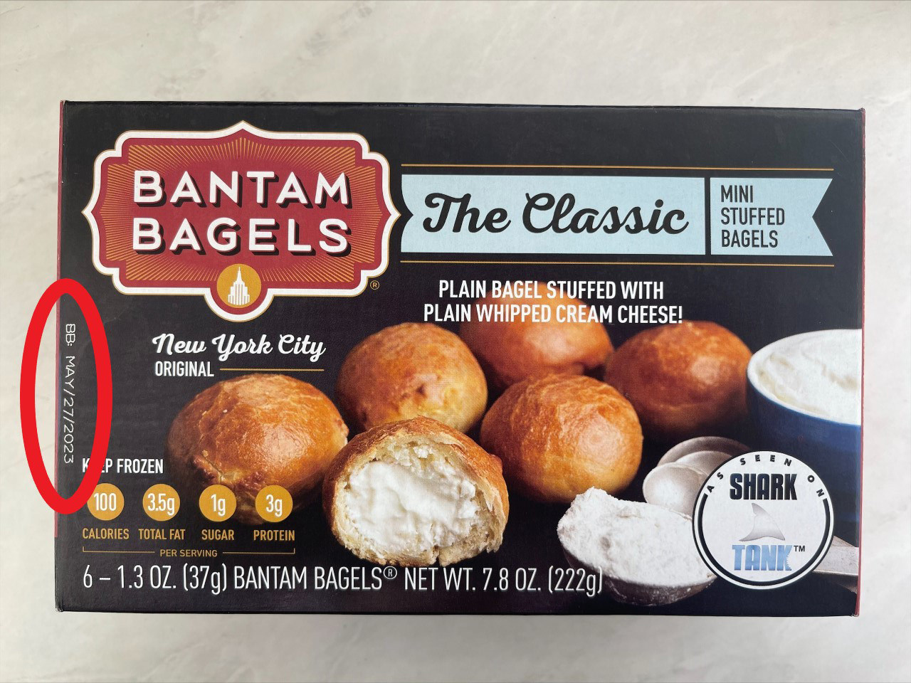 The frozen plain bagels stuffed with whipped cream cheese have best by dates of May 27, 2023 printed on the left side of 7.8 oz. (222g) “New York City Original” six-pack cartons and the top of the bag.