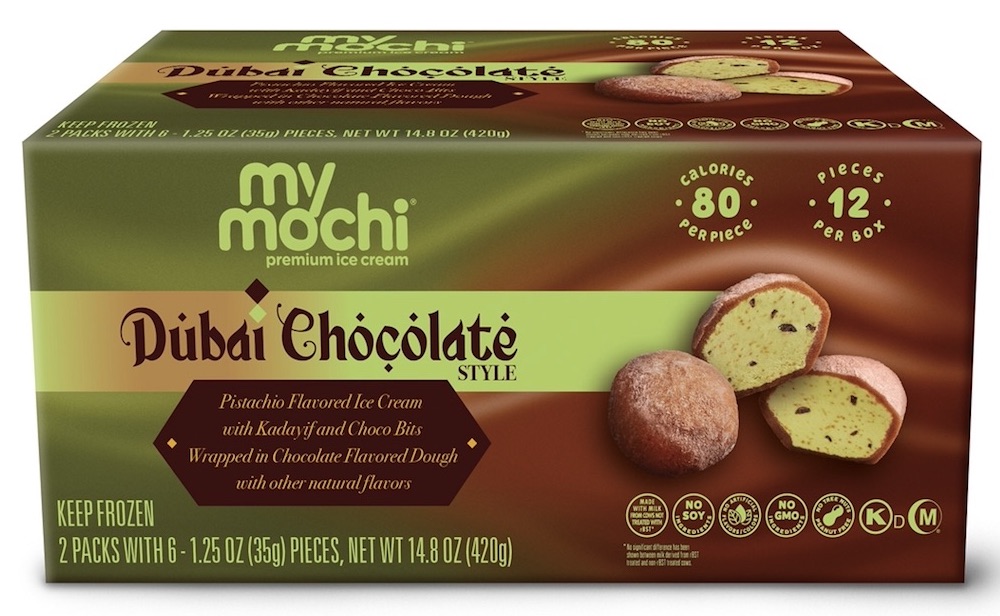 My/Mochi has launched the first Dubai Chocolate Style Mochi Ice Cream in the United States. The Los Angeles, California-based company has created its own version of the product featuring creamy pistachio flavored ice cream, crunchy kadayif made from Turkish phyllo dough, and chocolatey bits wrapped in chocolate flavored mochi dough. Twelve 80-calorie pieces come per box.