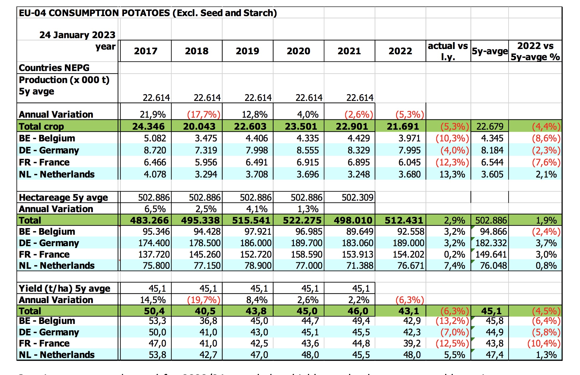 Lower potato production throughout Belgium, the Netherlands, France and Germany and little effect of inflation, has up to now resulted in reasonably good free market prices for producers, reported the North-western European Growers (NEPG) association on January 24. Higher contract prices and additional risks to farmers have already led and will lead to different consequences for the whole potato sector – from seed growers to retailers and consumers. Final area, yield and production figures show that in spite of 2.9% more hectares under cultivation compared to last year (512,400, or + 14.421)), a lower yield per hectare of -6,3% led to a total crop output harvest of 21.69 million tons (-5.3 %; ie a reduction of 1.2 million tons).