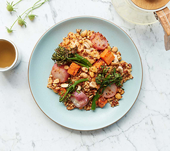 - Gochujang Cauliflower, Roasted Radishes, Broccolini and Chickpeas, and Riced Cauliflower with Chopped Cashews