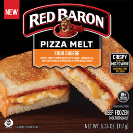 Pizza by the slice is nice enough as a favorite finger food. Now, for folks who like crispy cheese toasties with a bit of pizza pizzazz, Red Baron has begun rolling out Pizza Melt retail snack packs in North America. The panini-like product features “toppings” between toasted bread, rather than on top of a traditional pizza dough base. Three varieties are offered: