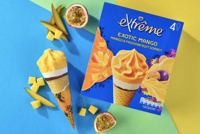 Froneri’s Extrȇme ice cream unit has launched the Exotic Mango & Passionfruit Sorbet Cone in four-packs selling for £3 in supermarkets and retail stores across Britain. The sweet treat features layers of fruity mango and passionfruit sorbets topped with mango and passionfruit sauce, which runs through the crunchy cone for an extra burst of flavor.