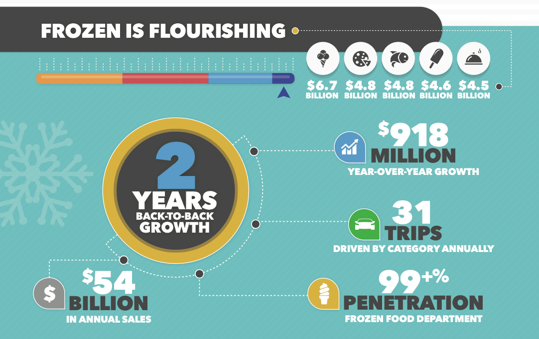 The frozen department showed two years of back-to-back growth with sales of $54.6 billion delivering $918 million in growth. The top-five selling frozen department categories were ice cream ($6.7 billion), pizza ($4.8 billion), seafood ($4.8 billion), novelties ($4.6 billion) and complete meals ($4.5 billion). Pizza, seafood, novelties, vegetables and prepared potatoes all showed solid growth with an increased percentage of dollar sales ranging from 3.7 to 5.1 percent versus the prior 52-weeks.