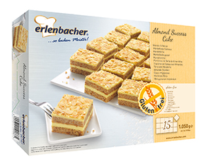 - Almond Success Cake: The name says it all for this product – especially since almonds are again successfully trending big time on the culinary scene in Europe and beyond, and enticing butter cream lies between fluffy almond sponge layers. The topping to round off the cake is another layer of butter cream and roasted almonds. Fifteen slices come 1.050g package.
