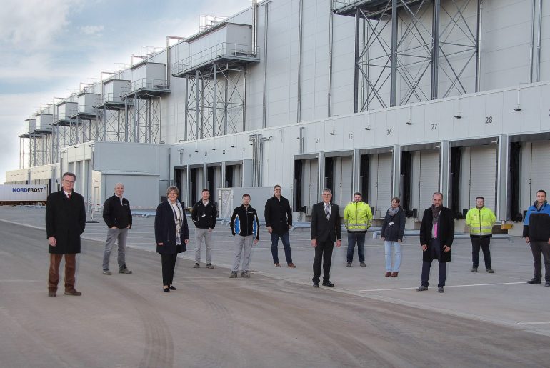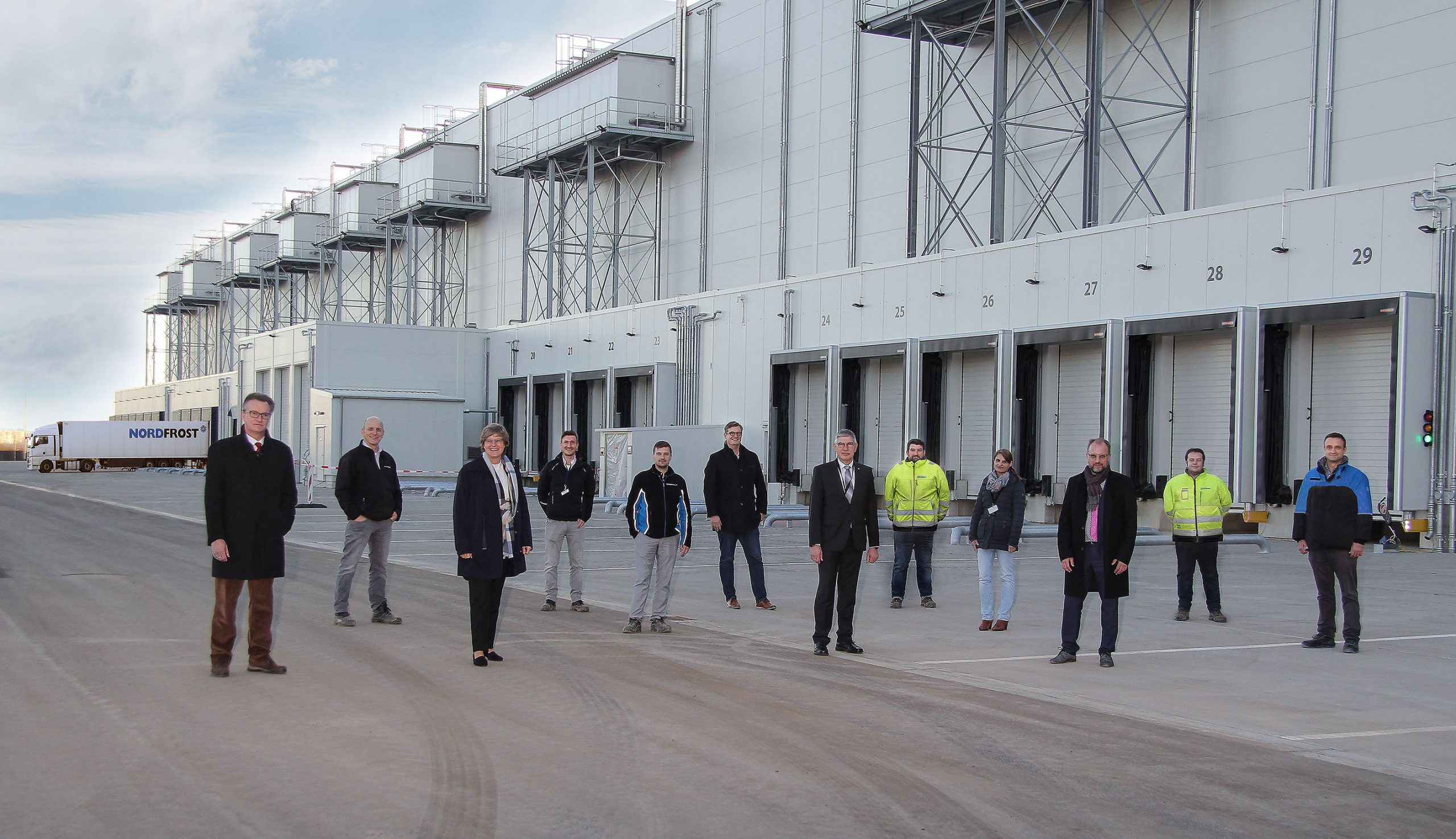 Dr. Falk Bartels, Nordfrost’s managing director (fourth from left in photo), remarked: “Here in Mücke, all temperature levels and value added services are available under one roof. In conjunction with the size of the storage capacities, this enables our customers to bundle assortments across different temperature ranges at a central warehouse location in Germany.”