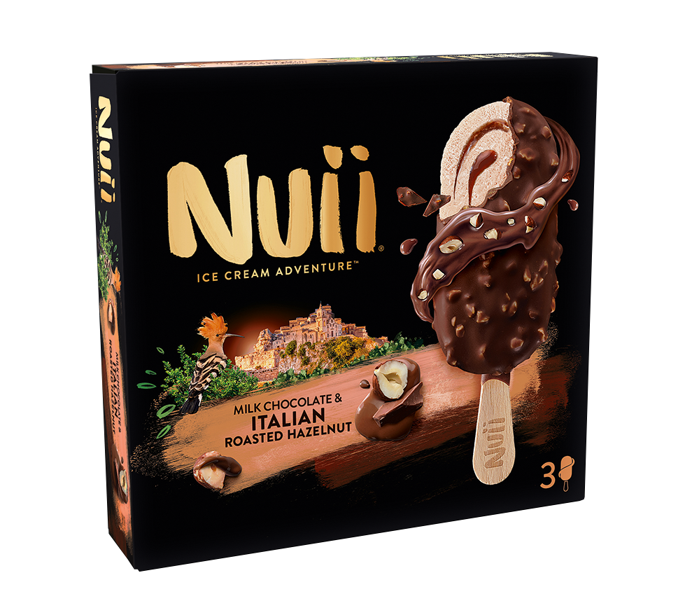 Milk Chocolate & Italian Roasted Hazelnut is the latest addition to the Nuii line of indulgent ice cream sticks offered by Frioneri in the United Kingdom. Currently available exclusively at Asda, the product will soon roll out to other major retail stores across Britain. The suggested retail price is £4 (three-pack, 90g).