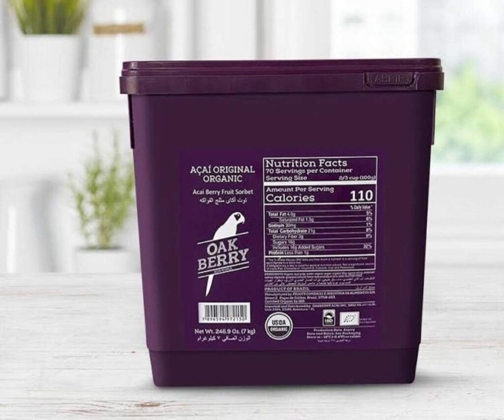 The brand’s Organic Açaí Berry Fruit Sorbet is distributed frozen by Amazon in 7 kg tubs (pictured below).