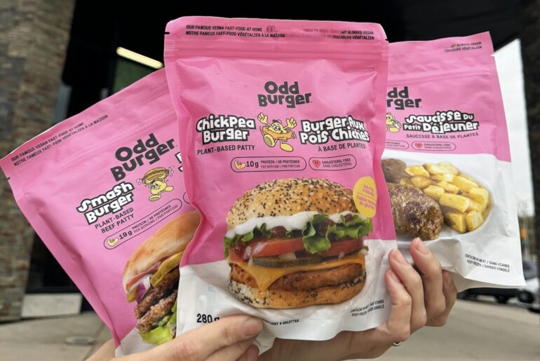 The Odd Burger vegan fast food restaurant franchise in Canada has expanded its frozen retail product range penetration in Ontario with a listing at Goodness Me! Natural Food Market locations across the province.This adds eight additional distribution points in Hamilton, Burlington, Waterloo, Guelph, Brantford, London, Barrie and Waterdown which stock Odd Burger SKUs including plant-based Breakfast Sausage, Smash Burgers and Chickpea Burgers.