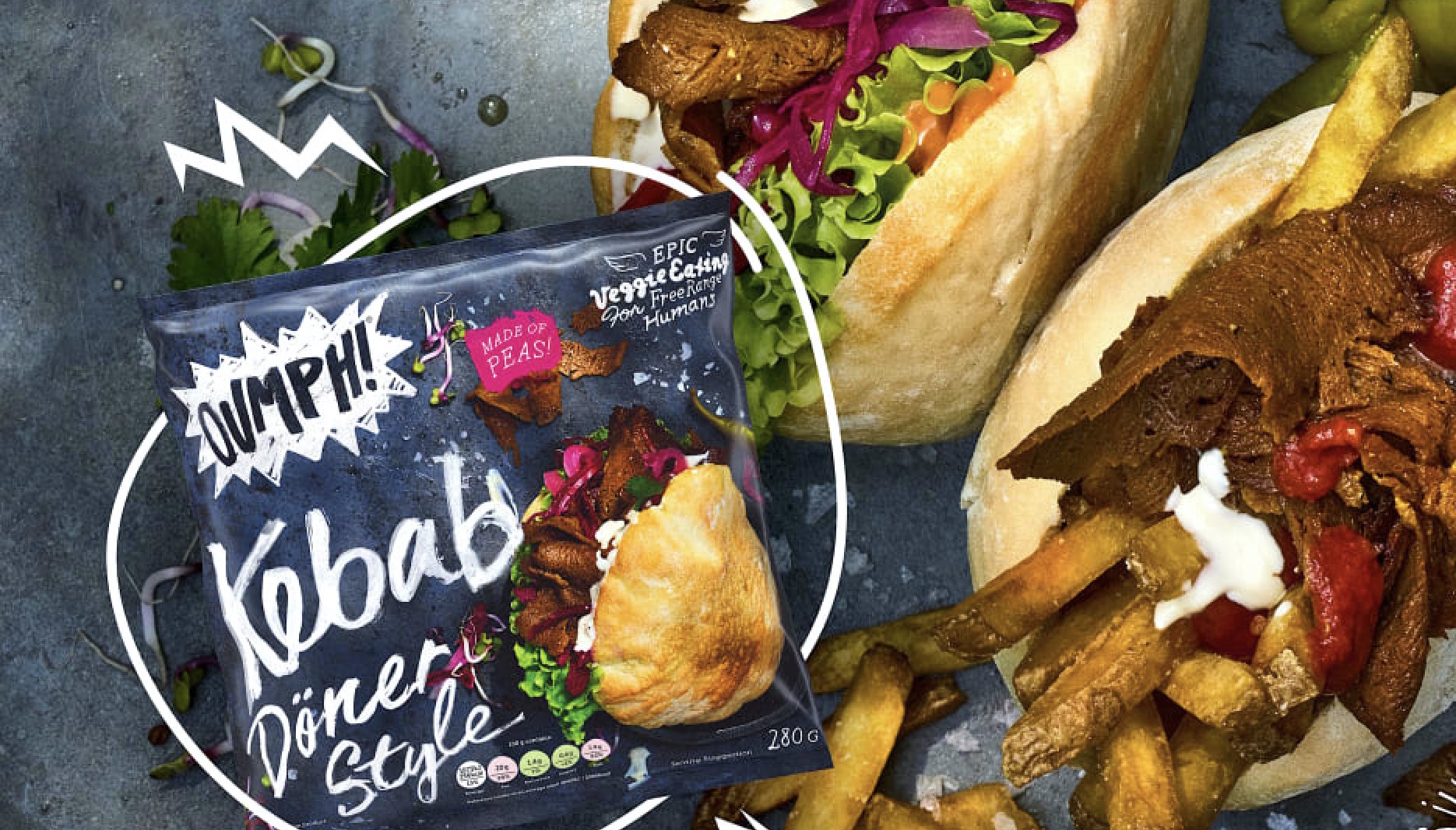 Faux meat Kebab Döner Style under the Oumph! label debuted in Iceland Foods freezer aisles in the United Kingdom on September 1. Made from pea protein shaved like traditional kebab meat for easy pita stuffing, the product is 100% plant-based and gluten free. The price per 280-gram pack is £3.