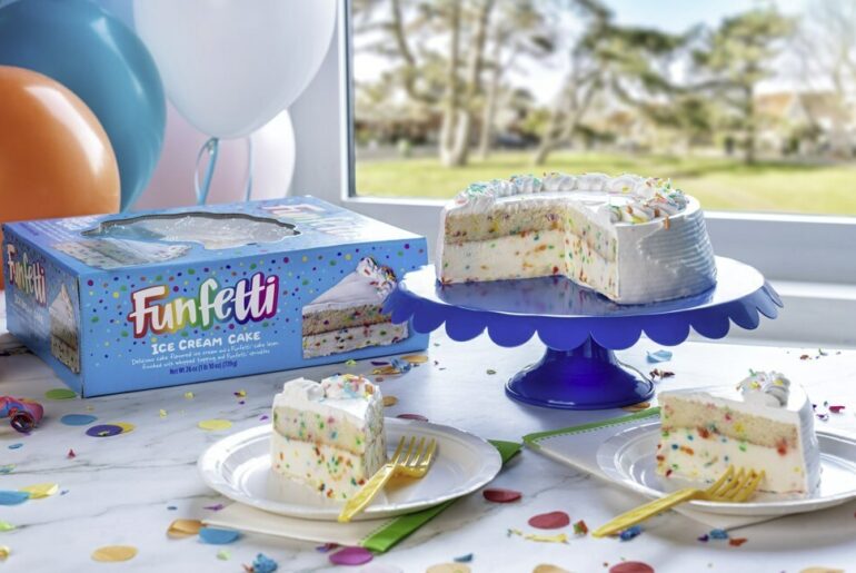 Made with birthday cake-flavored vanilla ice cream, classic Funfetti cake, whipped icing and colorful sprinkles, each round Funfetti Ice Cream Cake serves up to nine people and is priced at $19.99.