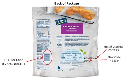 Perdue Breaded Chicken Breast Tenders in 29-oz packaging with a “Best If Used By” date” of 03/23/25 and UPC Bar Code of 0-72745-80431-1.