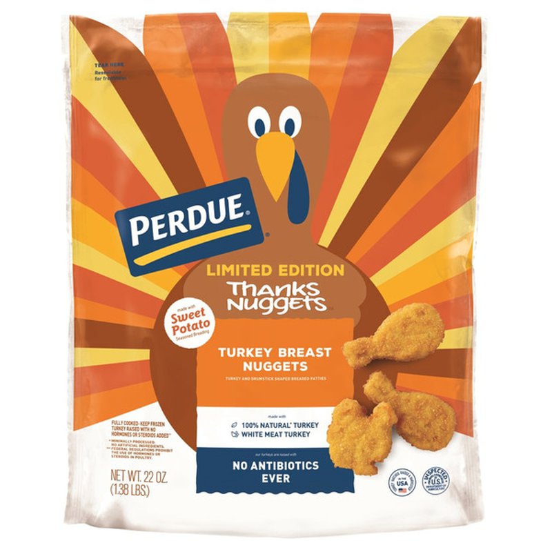 Perdue is bringing back Thanks Nuggets for a limited time while supplies last leading up to the Thanksgiving holiday season in the United States. Last year the product reportedly sold out online in less than three minutes. Now for the first time, the white breast meat with sweet potato-seasoned breaded turkey nuggets are available in the frozen food aisles of retail grocery stores nationwide.