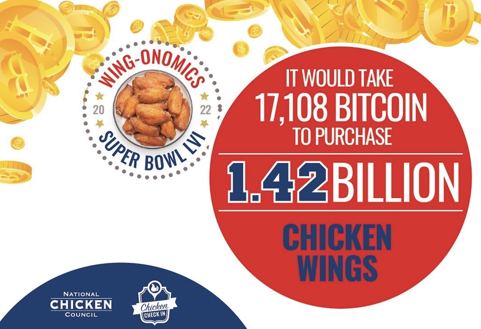 •It would take 17,108 bitcoin to purchase 1.42 billion wings (as of 1/28/22, the value of one Bitcoin was $36,418).
