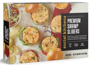 Distributed to restaurants and other foodservice operators frozen in packs containing two dozen 1.75 oz (50g) servings (seen below), the sliders boast solid chunks of shrimp seasoned with onion, red bell pepper and spices.