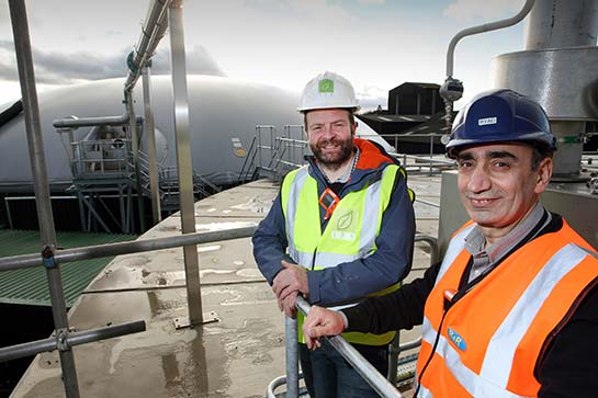 RRGenJames Thompson (left), head of operations at Stokesley, England-based anaerobic digestion plant developer JFS Associates, inspects the installation with Ryad Apasa, head of operations at R&R Ice Cream’s Leeming Bar site.