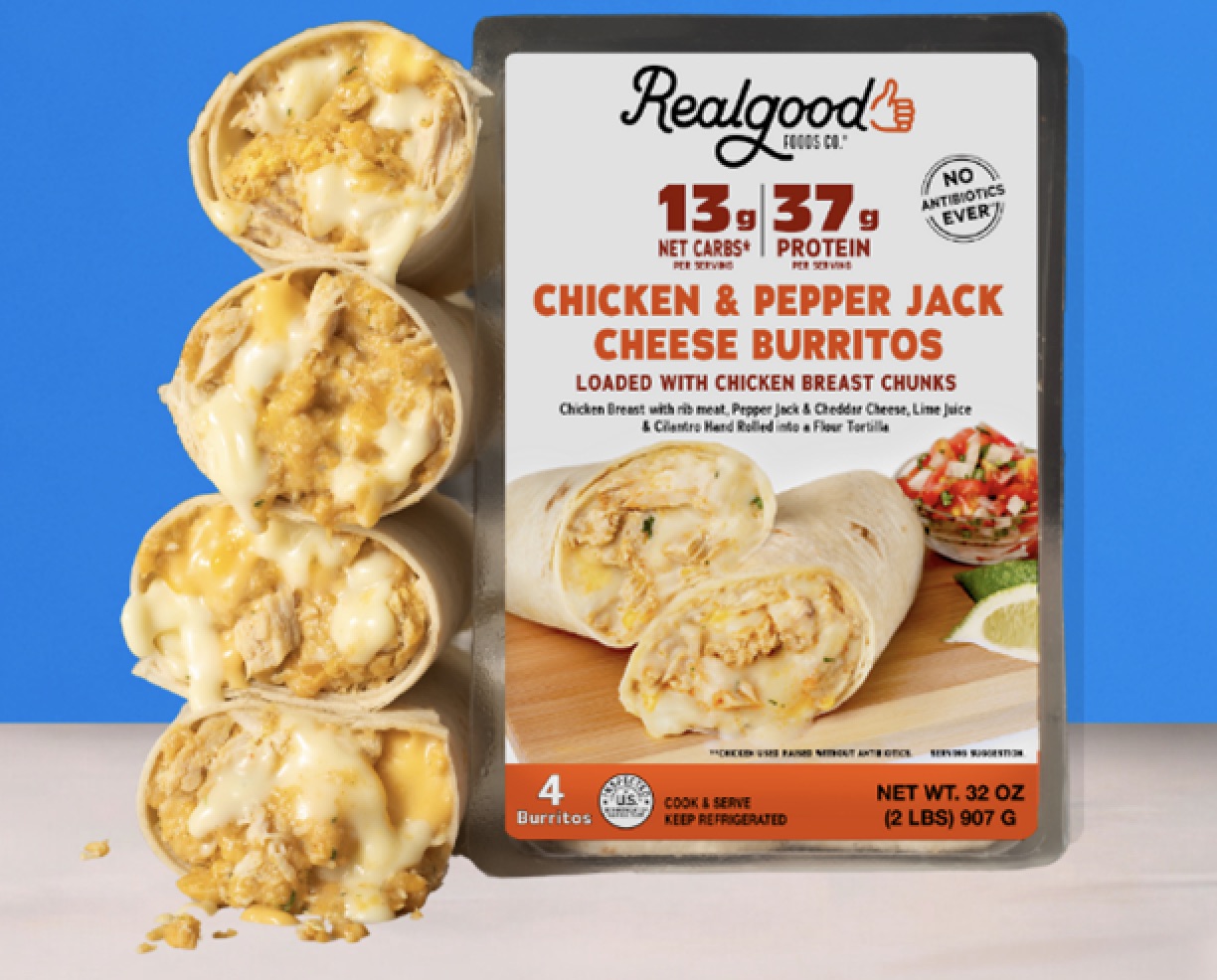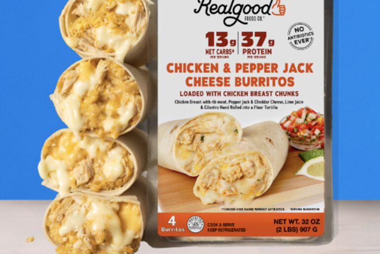 Realgood Chicken & Pepper Jack Cheese Burritos sold in the club channel boast 37 grams of protein and only 13 grams of net carbs, providing a low glycemic impact to consumers while satiating hardy appetites. Distribution is in 32-ounce packages containing four burritos.