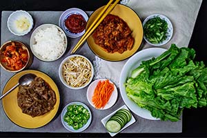 Among lunch specials are japchae dup bap (pan-fried sweet potato noodles with vegetables and a choice of beef, pork, chicken or tofu); L.A. kalbi; grilled salmon with Korean savory sauce; vegetable pajun (savory scallion pancake with mixed vegetables); vegetable gimpap (seaweed rice roll with finely chopped vegetables); and a variety of dol-sot bibimbap bowls (assorted vegetables and rice topped with a fried egg).