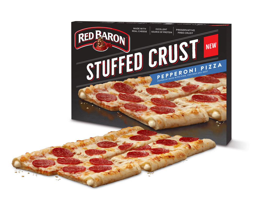 - Red Baron Stuffed Crust Pizza, featuring Pepperoni, Four Cheese and Meat-Trio flavors, has melted mozzarella baked right into the crust and a unique rectangular shape. It is now listed at select Walmart and Kroger stores for $7.49, and is slated to roll out in the freezer aisles of grocery stores nationwide in May 2021.