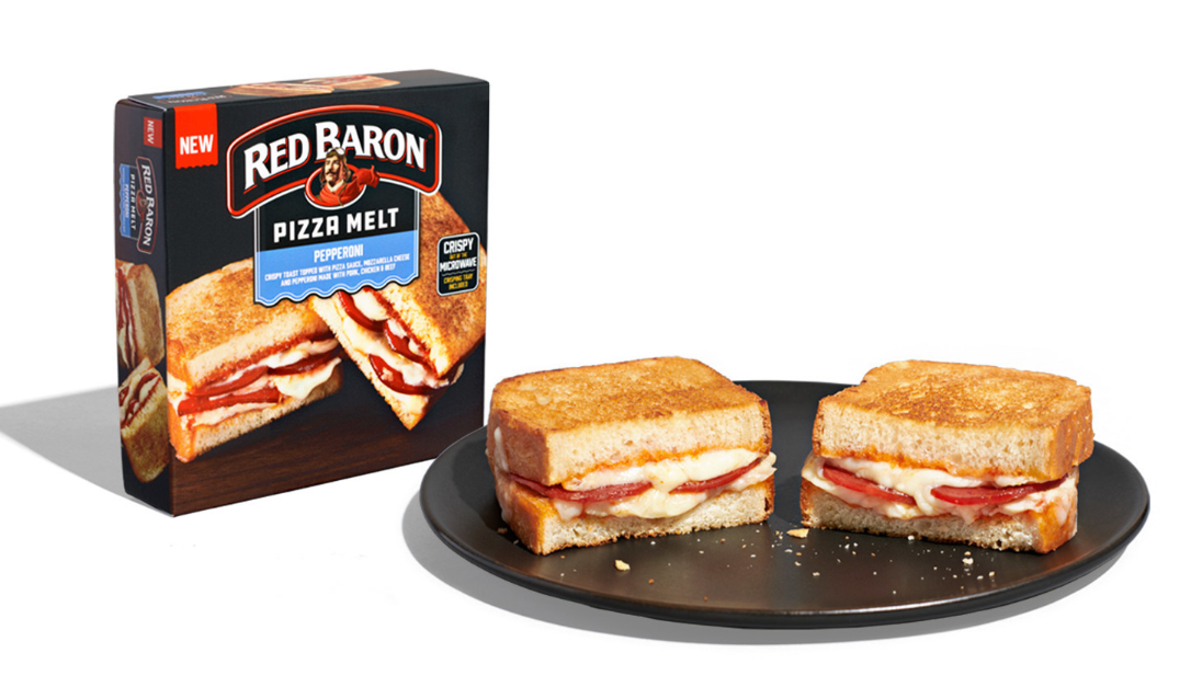 - Red Baron Pizza Melts deliver a melty, bold pizza flavor sandwiched between crispy toast and can be prepared a microwave oven in under three minutes. Available in Pepperoni, Four Cheese and Supreme flavors, the product is selling for a suggested retail price of $3.50 in the freezer sections of supermarkets and grocery stories throughout the USA.