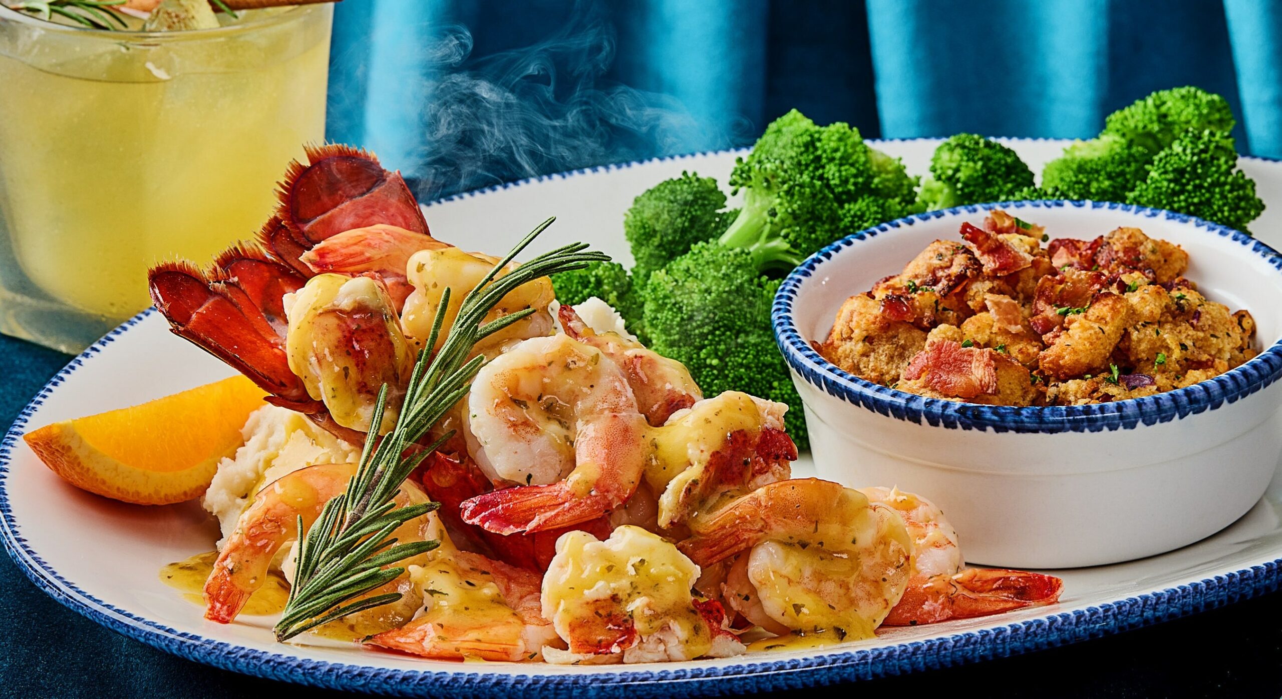 • Lobster & Cheddar Bay-Stuffed Shrimp – A roasted Maine lobster tail paired with shrimp topped with a savory brioche, Cheddar Bay, bacon and mushroom stuffing. It’s served with a choice of two side dishes.