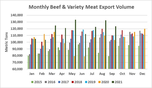 Beef shipments to destinations outside the United States continued to soar in September at 123,628 metric tons (mt), up 20% from a year ago and the fourth largest volume of the post-BSE era. Export value jumped 59% to $954.1 million – the second highest month on record, trailing only August 2021. For the first three quarters of 2021, beef exports increased 18% from a year ago to 1.08 million mt, valued at $7.58 billion – up more than $2 billion (36%) from the same period last year. Compared to the record year of 2018, January-September exports were 7% higher in volume and up 24% in value.