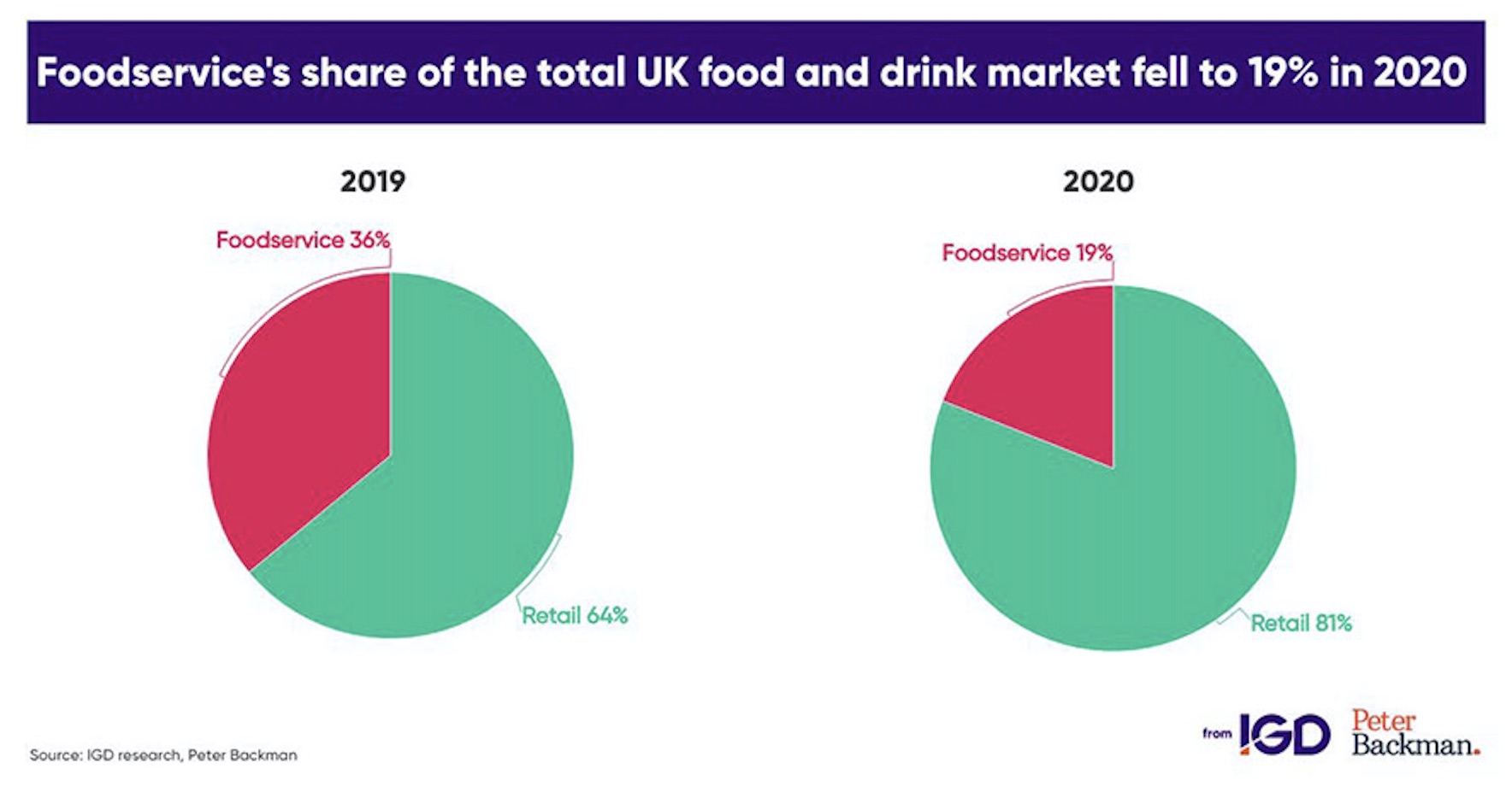 Produced in collaboration with foodservice consultant Peter Backman, the report provides insight into in-home and out-of-home food and drink spending patterns, which saw the grocery retail sector’s share of market grow from 64% in 2019 to 81% last year. Meanwhile, the eating out sector shrank by over 50%.