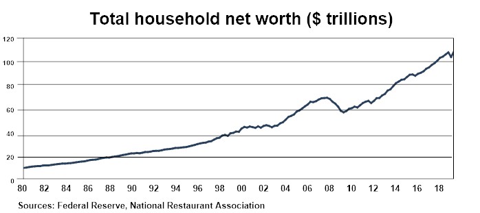Buoyed by rising house prices and one of the longest-running bull markets in stocks in US history, household wealth trended steadily higher in recent years. After a drop of nearly 4 percent in the fourth quarter of 2018, total household net worth rebounded to top $108 trillion in early 2019. This is 57 percent above its pre-recession peak in 2007, and has a positive impact on the current and future financial decisions of consumers.