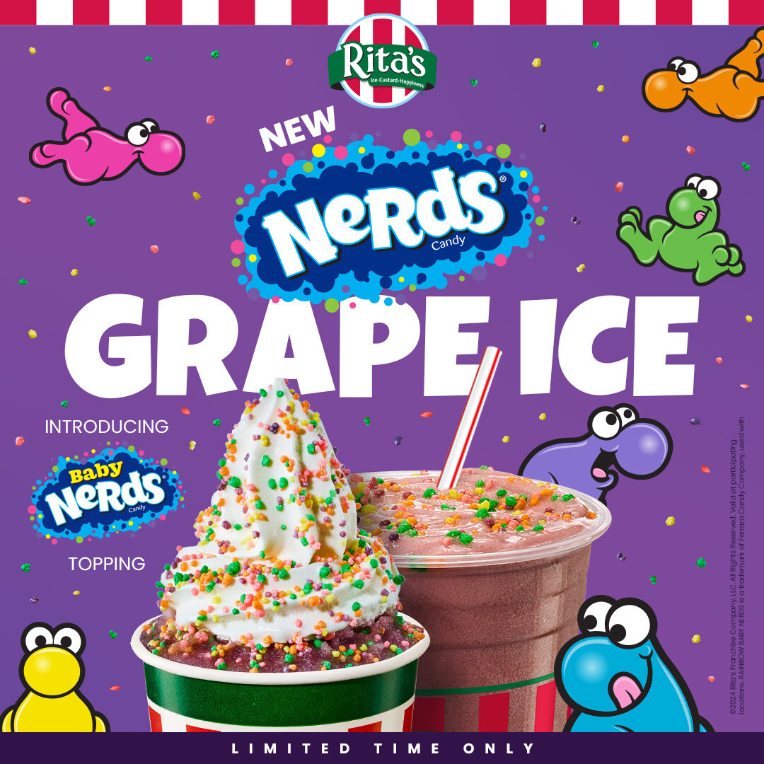 Rita’s Italian Ice & Frozen Custard has debuted its latest summer flavor in partnership with Nerds, the popular multi-sensorial candy brand from Ferrara. Nerds Grape flavored Ice with Baby Nerds topping is now available for a limited time at all Rita’s 550-plus frozen dessert shops across the United States.