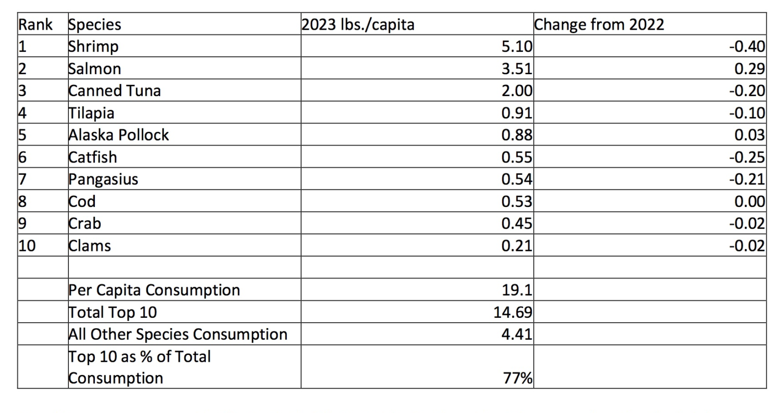 “Another important takeaway is the percentage of the Top 10 that makes up total consumption,” said Barry. “This list makes up 77% of all consumption. The list before, from 2022, made up 79%. In the mid-teens that number was up well over 90%. The data illustrates a continued diversification of America’s seafood palate.”