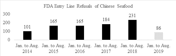 As imports of Chinese farmed seafood have declined, so has the number of entry lines of Chinese seafood refused at the border by the US Food and Drug Administration (FDA). As the chart below shows, through August of this year the FDA has reported refusing 86 entry lines of Chinese seafood compared to 231 entry lines over the same time period last year: