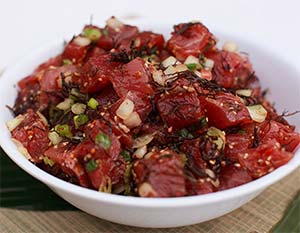 The culinary tsunami from Hawaii that is reaching shores and stores around the world is most interesting indeed, as people who have never set foot within the island chain are increasingly able to taste versions of the local delicacy that include favorites featuring ahi, limu, salt, green and white onions, and inamona (roasted, chopped kukui nuts); and spicy ahi poke (ahi and a creamy, spicy mayonnaise sauce with tobiko).