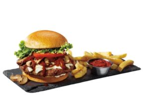 A.1. Steak Sauce Burger. This juicy beef burger is layered with melted Swiss, Portabella mushrooms, lettuce, tomato and mayo, and finished with a generous drizzle of A.1. steak sauce. It’s served with fries, as seen below.