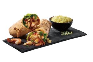 Wonton Shrimp Wrap. Tasty grilled shrimp, crispy Applewood-smoked bacon, crunchy wontons, lettuce and toasted sesame ginger dressing, all in a tomato wrap, is served with fries, as seen below.