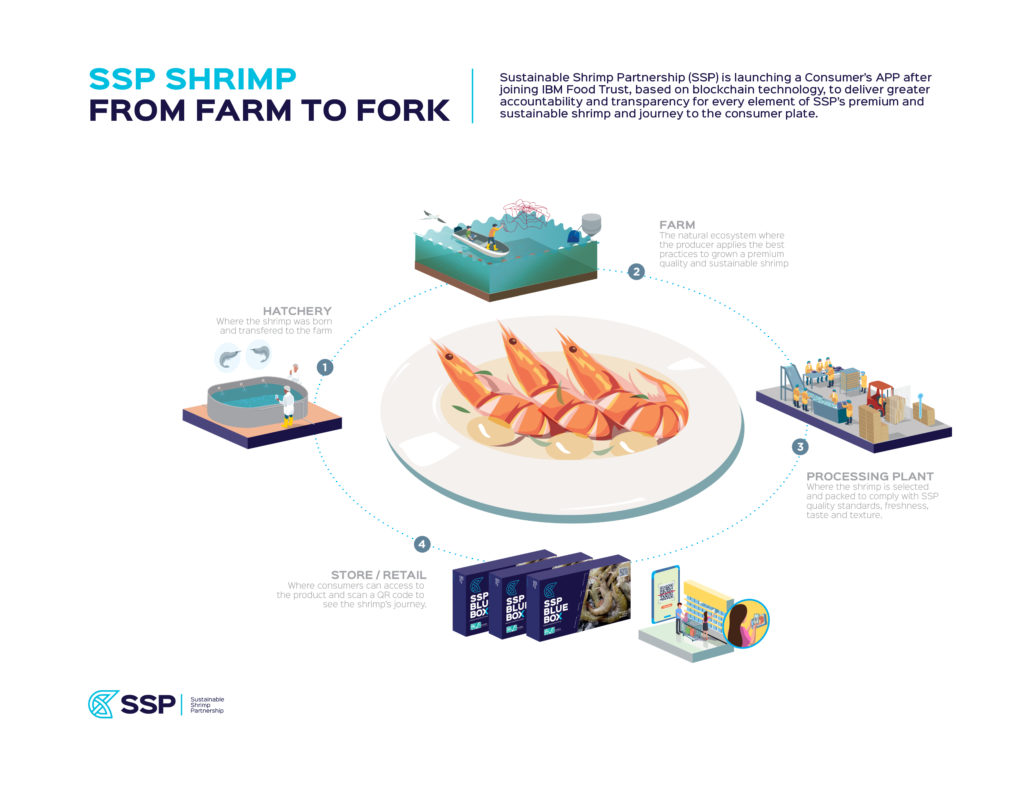 SSP shrimp is produced to the highest social and environmental standards – ASC certified, use of zero antibiotics, and with neutral impact on local water quality. The Blockchain Traceability Project was co-financed by The Sustainable Trade Initiative (IDH), an SSP Advisory Board Member.