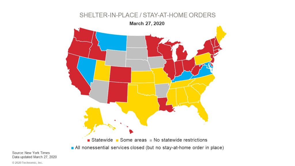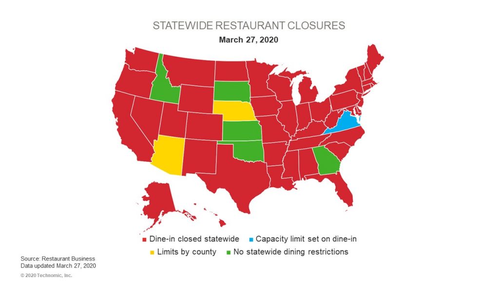 Stay-at-home and shelter-in-place orders force the closure of all nonessential businesses (the definition of which varies from state to state). Residents are generally still permitted to go outside for exercise, to the grocery store or to the doctor, but these orders represent a significant shutdown of state economies and stricter enforcement of social distancing. Along with these orders, most states are prohibiting dine-in services or placing strict capacity limits, allowing only for pickup, drive-thru and delivery services.