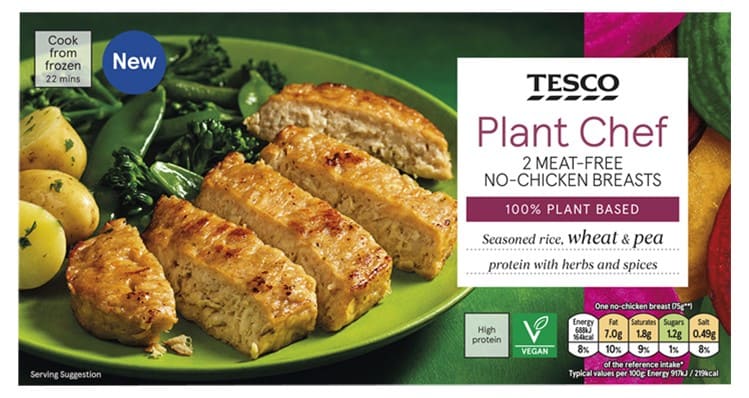 Meatless No-Chicken Breasts featuring seasoned rice, wheat and pea incredients, and Fish-Free Goujons made of rice and parsnip are now available under the Tesco Plant Chef private label line in the United Kingdom. The products are among five new frozen plant-based offerings rolled out at the retail chain’s stores during the “Veganuary” period when many non-vegetarians and flexitarians reduce consumption of meat.