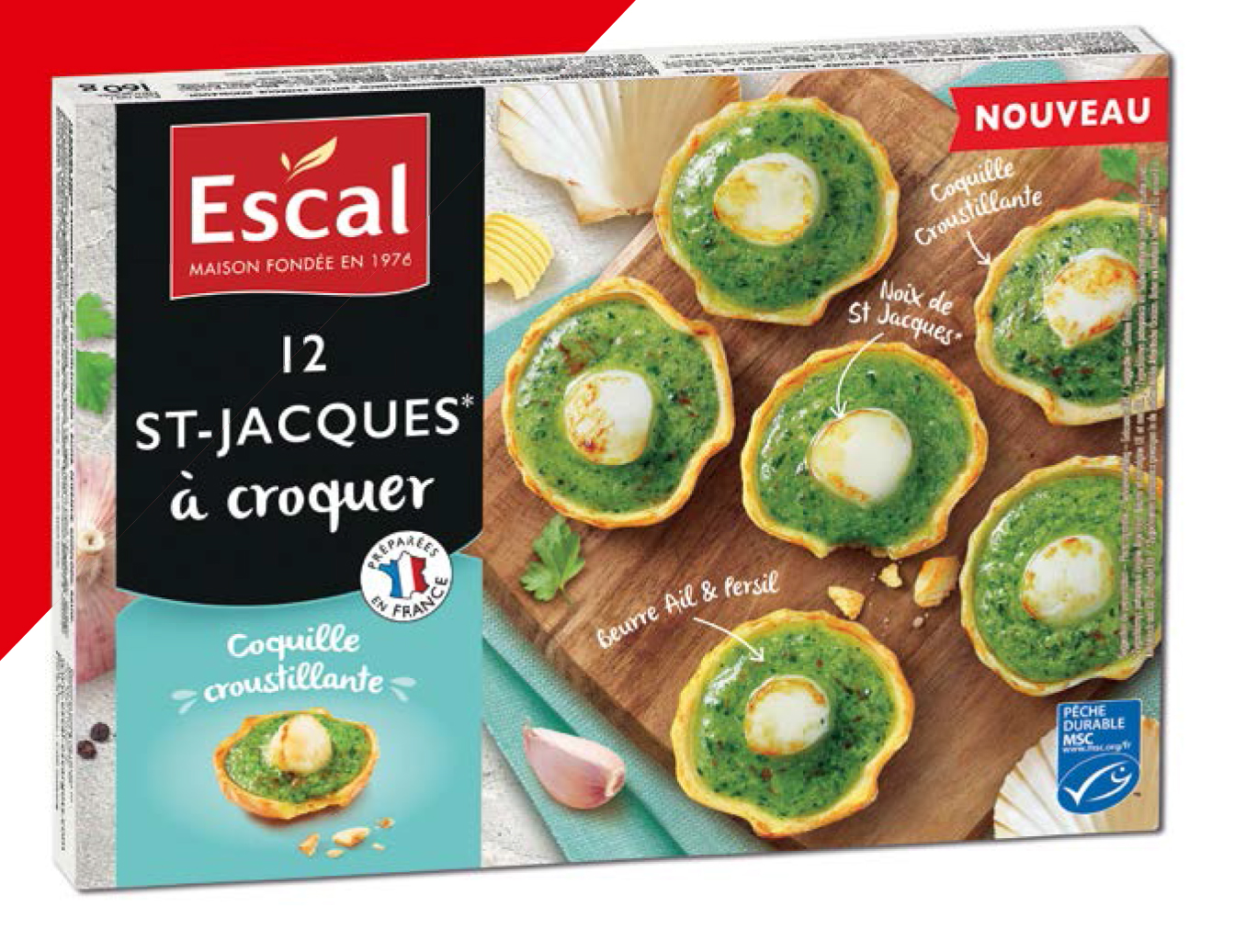• 12 Scallops in Crispy Waffer Shell from France’s Escal are served on crispy waffers with finely tuned garlic-parsley cream as an appetizer.